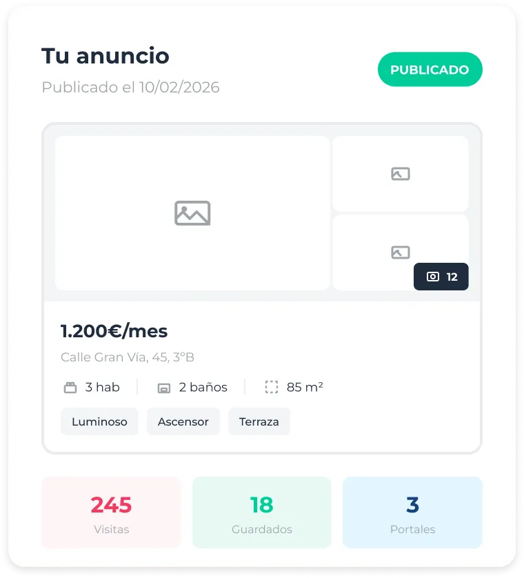 Enviamos a un fotógrafo profesional para capturar las mejores imágenes de tu piso. Con las fotos y la información completa, publicamos tu propiedad en los principales portales inmobiliarios con posicionamiento preferente, asegurándonos de que atraigas al público adecuado.